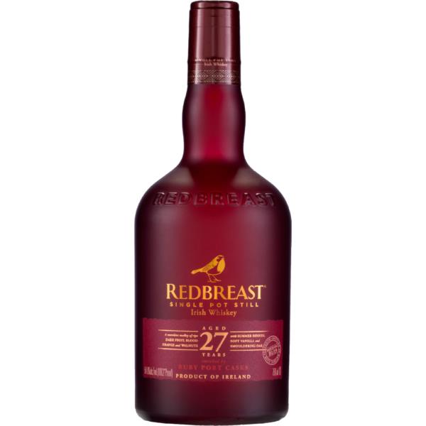 Redbreast 27-Year-Old. Matured for no less than 27 years in the finest casks, the remarkable Redbreast 27-Year-Old represents the pinnacle of our signature style. This whiskey is composed of whiskeys matured in ex-bourbon, oloroso sherry, and predominantly ruby port casks. Bottled at cask strength, it provides a full-bodied experience, offers a rich and complex tasting experience with notes of ripe fruits, spices, and toasted oak. Expect a medley of dark fruits like cherries and plums, balanced by vanilla sweetness, cinnamon spice, and hints of chili oil. The finish is long and satisfying, with lingering oak and fruit notes.