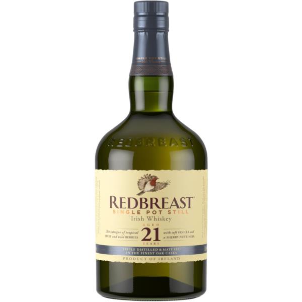 Redbreast 21-Year-Old . Sets an exceptional standard for what Single Pot Still Irish Whiskey should be, showcasing unparalleled depth and complexity from its 21-year maturation. It features a nose of fresh tropical fruits, nuts, and rich dried fruits. The palate offers soft vanilla, toasted oak, sherry nuttiness, and spices. The finish is long and spicy, with notes of oak, barley, and lingering fruit. Produced in very limited quantities, Redbreast 21-Year-Old is truly a masterpiece in every bottle.